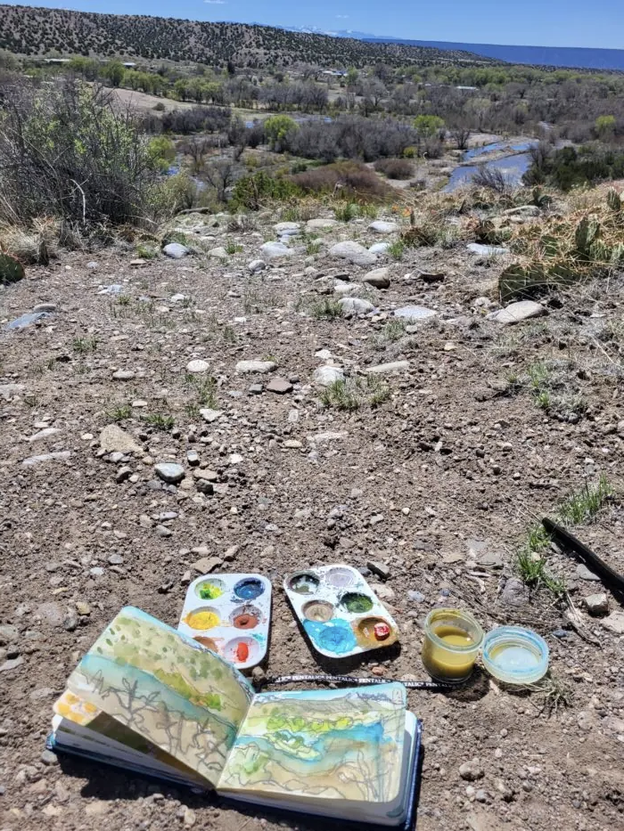 I love how a geography defines the palette for my daily practice travel sketching. From New York, unintentionally, my sketches are mostly graphite, and washes. Not a reflection of how colorful New York is, but there’s no doubt there’s lots of concrete. In New Mexico, it was impossible to resist color: the blues, the earth tones and since it was spring, some intense bright greens abounded.