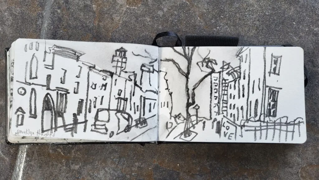 First, New York City. There, I wasn’t really alone too much. I was staying with a dear friend in Washington Heights, who handed me carefully off to my Brooklyn nieces in the middle of the trip, who handed me back to him for the rest of the visit… my sweet people making sure I didn’t brave the NY subway system by myself (but boy, did I learn about subway maneuvers!). However, much of my museum-going was solo. One day, I spent the afternoon alone in The Cloisters. I sketched there, plein air, instead of working from photos later as I often do. It was luxurious to have the time – as long as I wanted – to wander and sit and sketch. The Cloisters are lovely in that way.